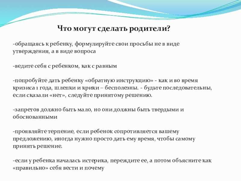 -попробуйте дать ребенку «обратную инструкцию» - как и во время кризиса 1 года, шлепки и крики – бесполезны. - будьте последовательны, если сказали «нет», следуйте принятому решению.