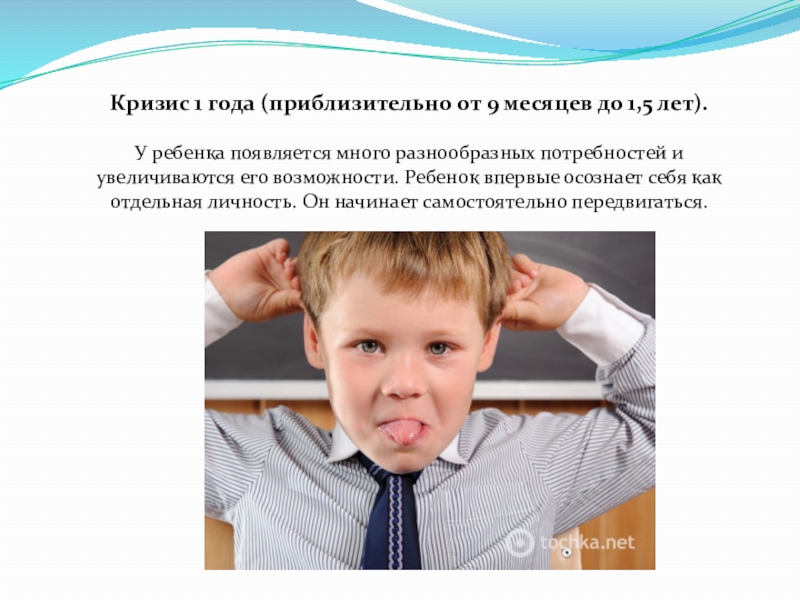 Слайд 3Кризис 1 года (приблизительно от 9 месяцев до 1,5 лет).