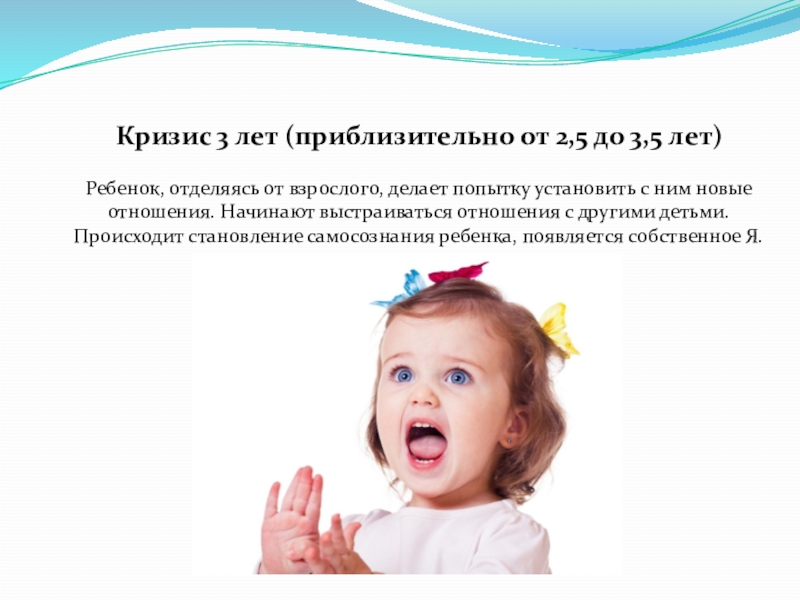 Кризис 3 лет (приблизительно от 2,5 до 3,5 лет)Ребенок, отделяясь от взрослого, делает попытку установить с ним