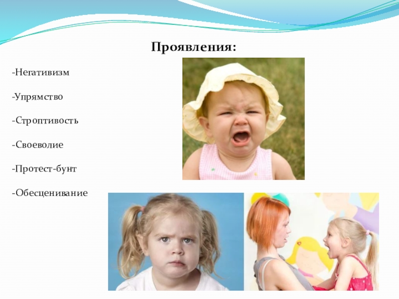 Проявления:-Негативизм -Упрямство -Строптивость-Своеволие -Протест-бунт-Обесценивание