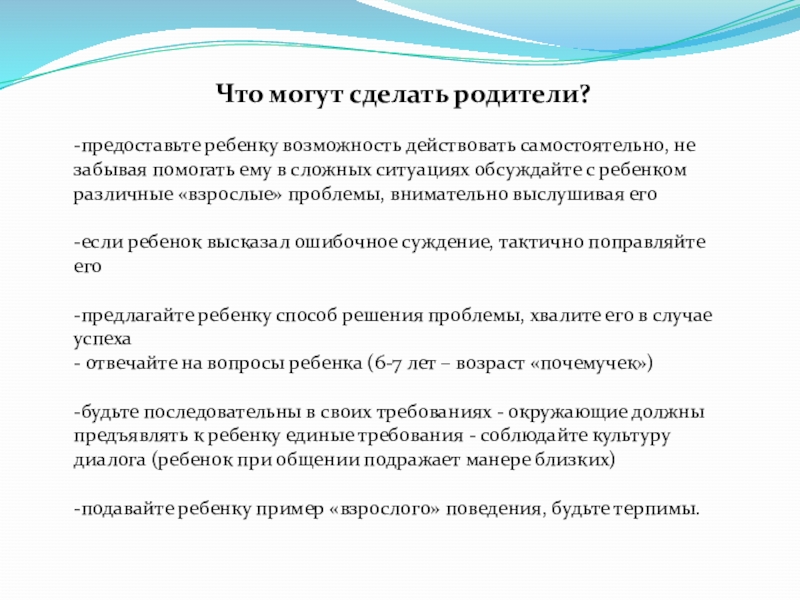 Что могут сделать родители?-предоставьте ребенку возможность действовать самостоятельно, не забывая помогать ему в сложных ситуациях обсуждайте с