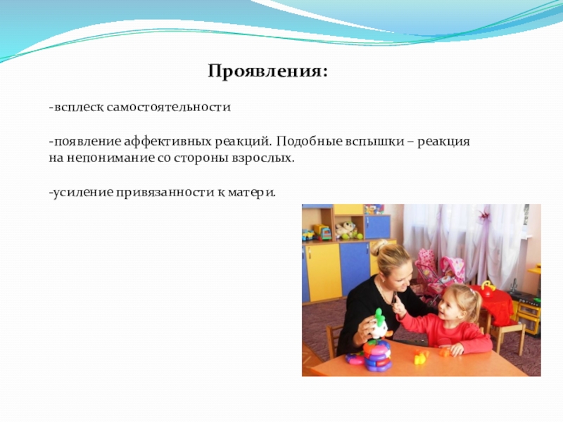 Проявления:-всплеск самостоятельности-появление аффективных реакций. Подобные вспышки – реакция на непонимание со стороны взрослых.-усиление привязанности к матери.