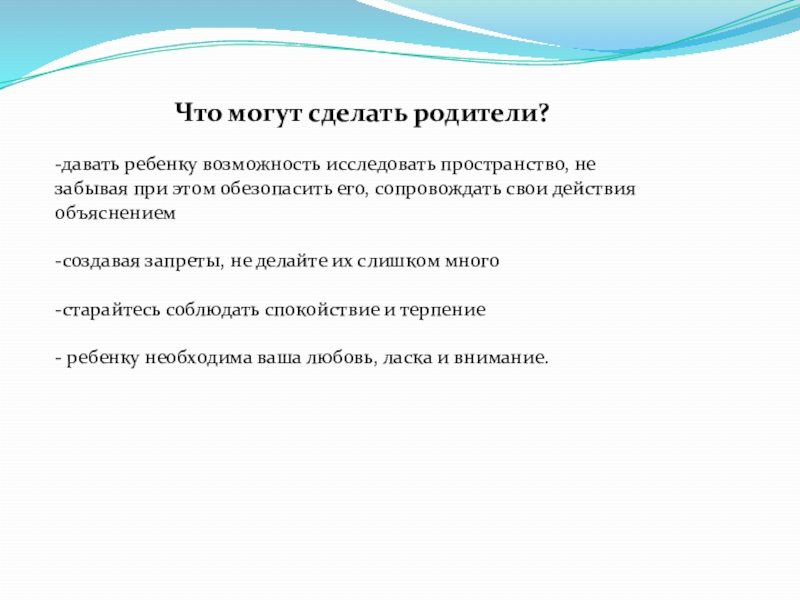 Что могут сделать родители?-давать ребенку возможность исследовать пространство, не забывая при этом обезопасить его, сопровождать свои действия