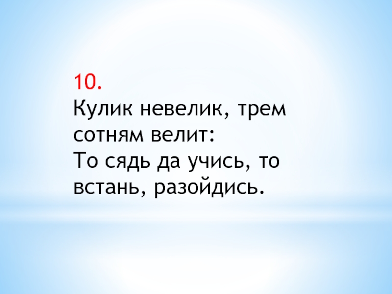 10.Кулик невелик, трем сотням велит:То сядь да учись, то встань, разойдись.
