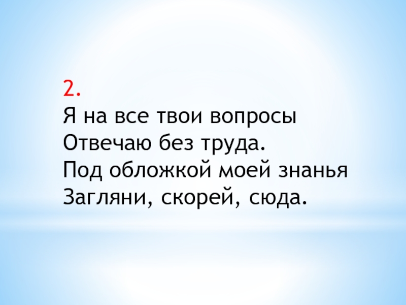 2.Я на все твои вопросыОтвечаю без труда.Под обложкой моей знаньяЗагляни, скорей, сюда.