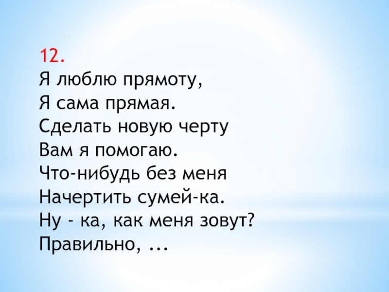 12.Я люблю прямоту,Я сама прямая.Сделать новую чертуВам я помогаю.Что-нибудь без меняНачертить сумей-ка.Ну - ка, как меня зовут?Правильно,