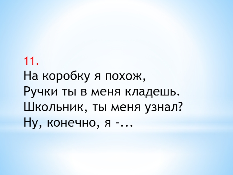 11.На коробку я похож,Ручки ты в меня кладешь.Школьник, ты меня узнал?Ну, конечно, я -...