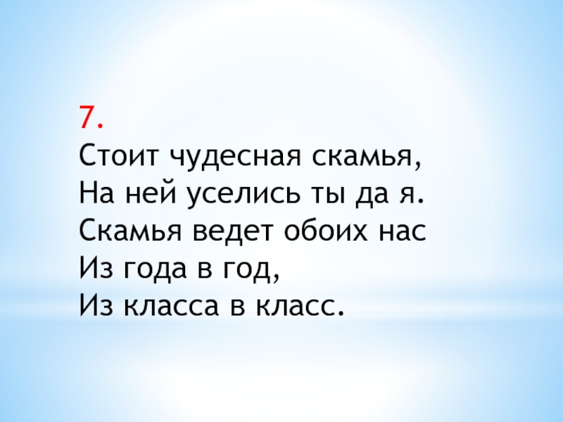 7.Стоит чудесная скамья,На ней уселись ты да я.Скамья ведет обоих насИз года в год,Из класса в класс.