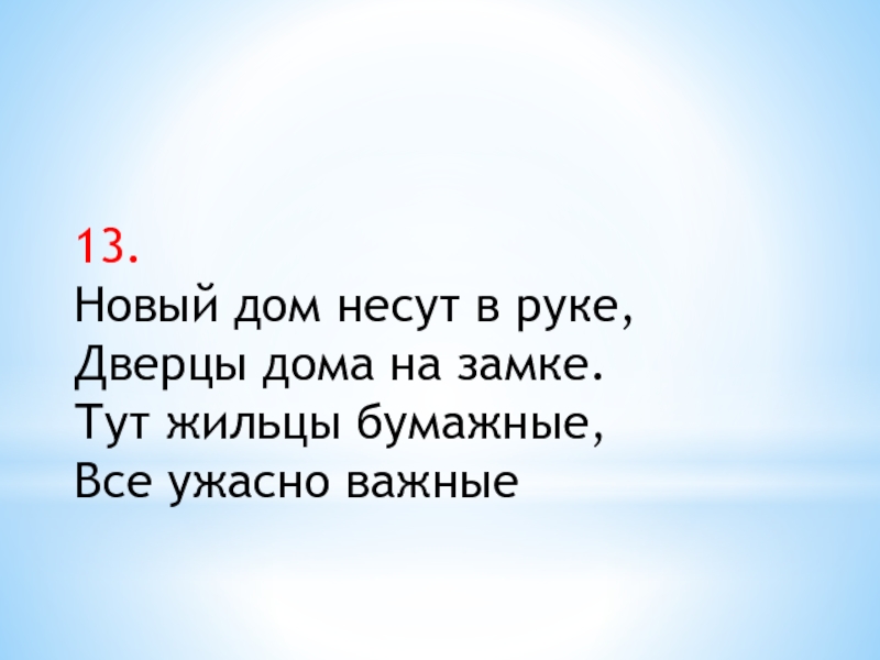 13.Новый дом несут в руке,Дверцы дома на замке.Тут жильцы бумажные,Все ужасно важные