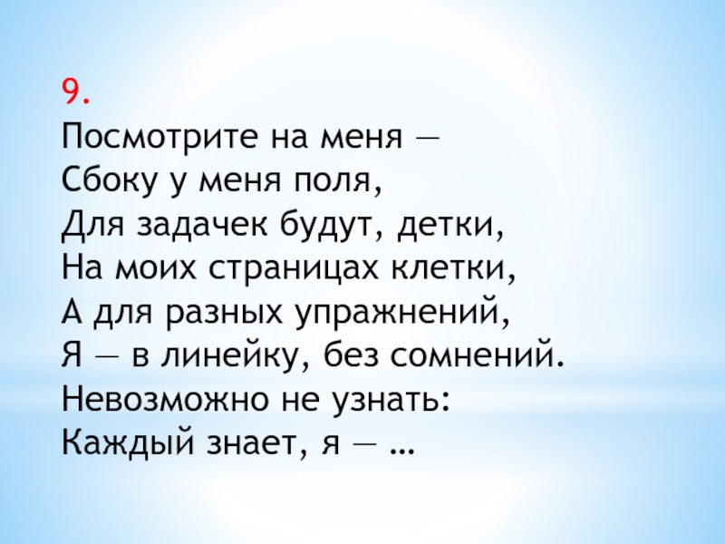 9.Посмотрите на меня —Сбоку у меня поля,Для задачек будут, детки,На моих страницах клетки,А для разных упражнений,Я —