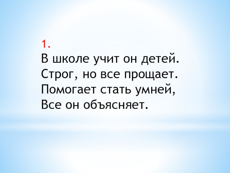 1.В школе учит он детей.Строг, но все прощает.Помогает стать умней,Все он объясняет.