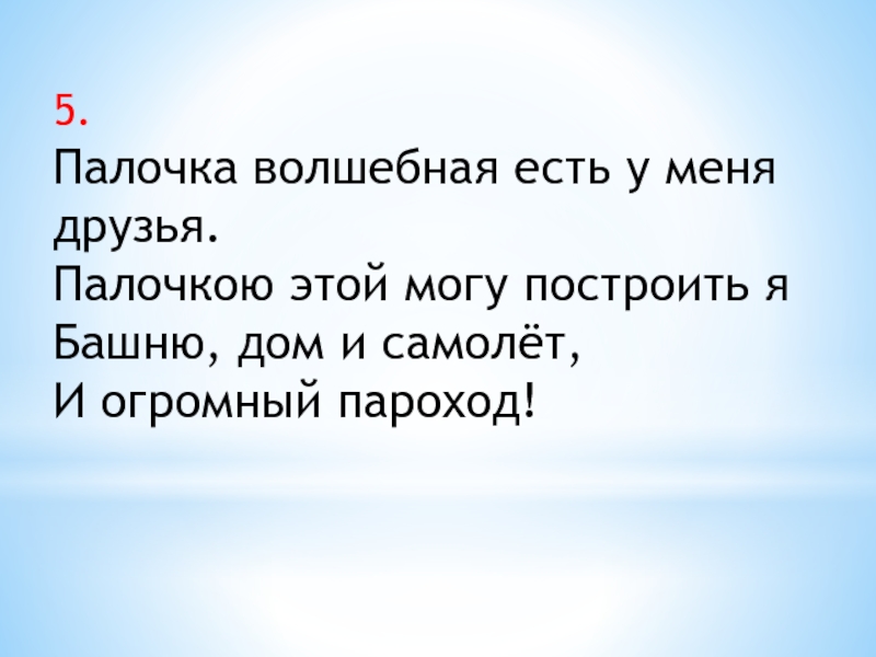 5.Палочка волшебная есть у меня друзья.Палочкою этой могу построить яБашню, дом и самолёт,И огромный пароход!