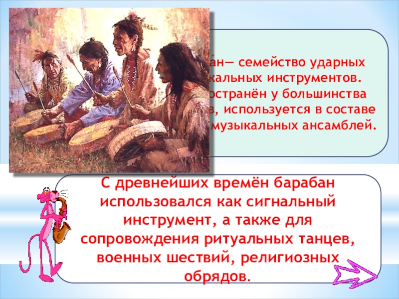 С древнейших времён барабан использовался как сигнальный инструмент, а также для сопровождения ритуальных танцев, военных шествий, религиозных обрядов.