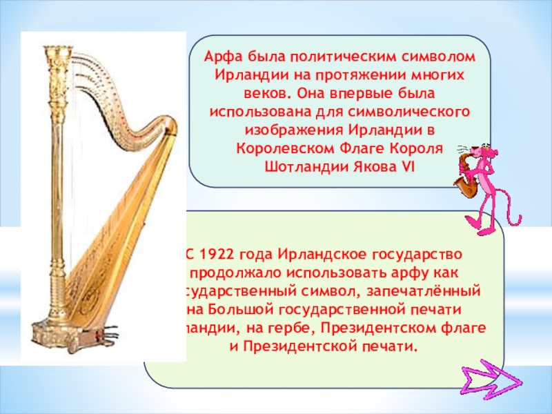 С 1922 года Ирландское государство продолжало использовать арфу как государственный символ, запечатлённый на Большой государственной печати Ирландии, на гербе, Президентском флаге и Президентской печати.