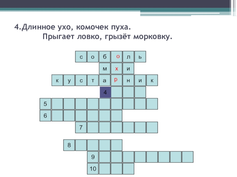 4.Длинное ухо, комочек пуха.       Прыгает ловко, грызёт морковку.ьлбосимхккуинста5679810о р4