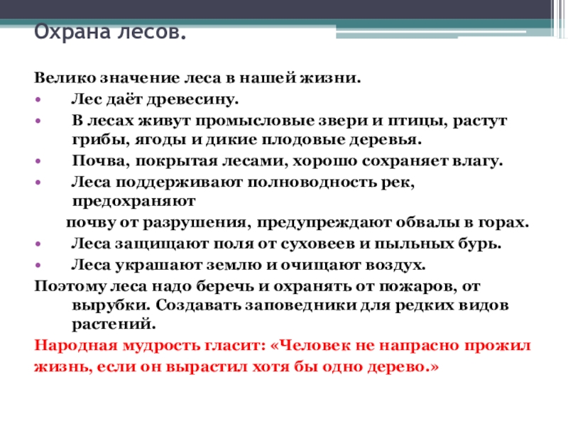 Охрана лесов.Велико значение леса в нашей жизни. Лес даёт древесину.В лесах живут промысловые звери и птицы, растут