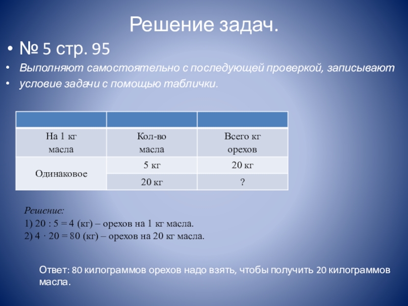 Ответ: 80 килограммов орехов надо взять, чтобы получить 20 килограммов масла.