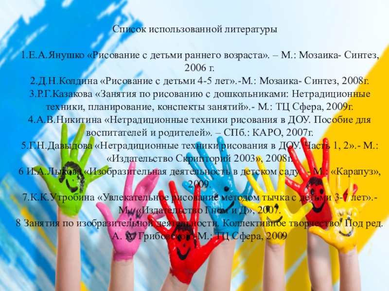 3.Р.Г.Казакова «Занятия по рисованию с дошкольниками: Нетрадиционные техники, планирование, конспекты занятий».- М.: ТЦ Сфера, 2009г.