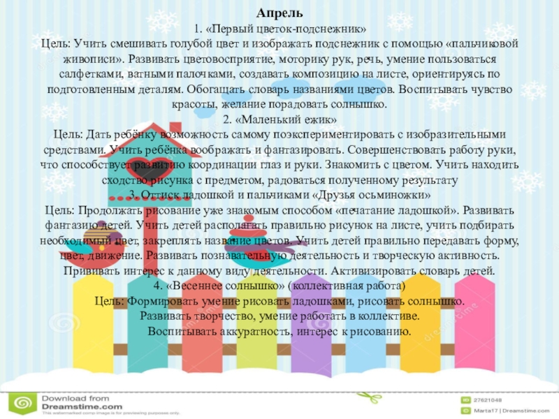 рисования «печатания ладошкой». Обогащать и уточнять представления об окружающем мире, в том числе о цветке подснежнике; расширить словарный запас. Воспитывать бережное отношение к природе, отзывчивость, доброжелательность, желание помогать другим, формировать умение работать в коллективе. Продолжать формировать умение выразительно рассказывать стихотворение наизусть;
