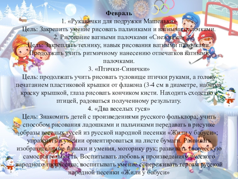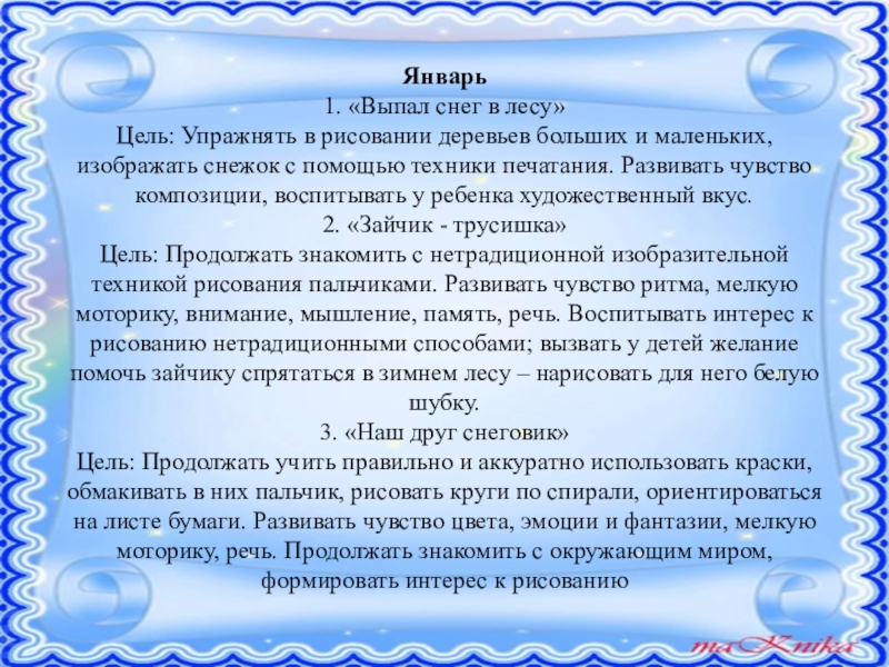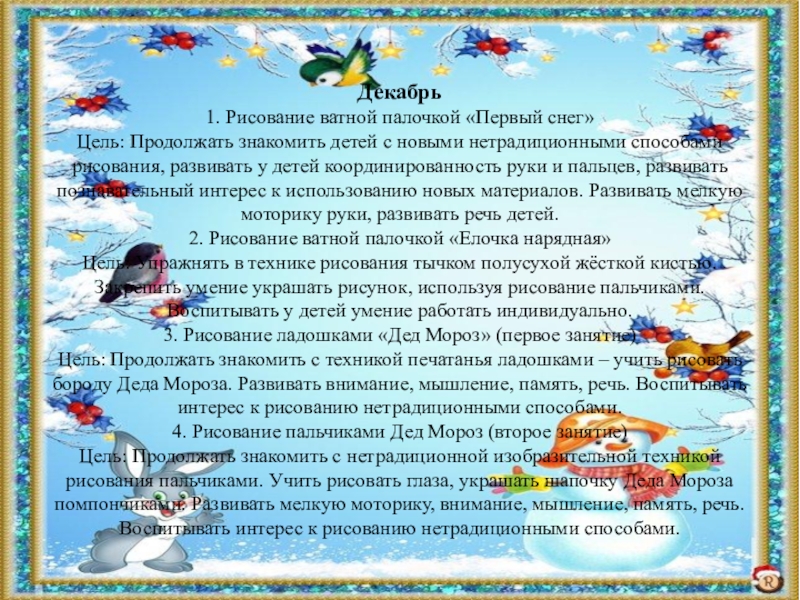 маленьких, изображать снежок с помощью техники печатания. Развивать чувство композиции, воспитывать у ребенка художественный вкус.