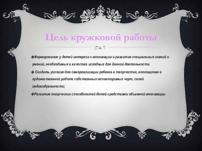 Цель кружковой работыФормирование у детей интереса к аппликации и развитие специальных знаний и умений, необходимых в качестве исходных для данной деятельности. Создать условия для самореализации ребенка в творчестве, воплощения в художественной работе собственных неповторимых черт, своей