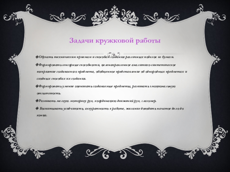 Задачи кружковой работыОбучать техническим приемам и способам создания различных поделок из бумаги.Формировать сенсорные способности, целенаправленное аналитико-синтетическое восприятие