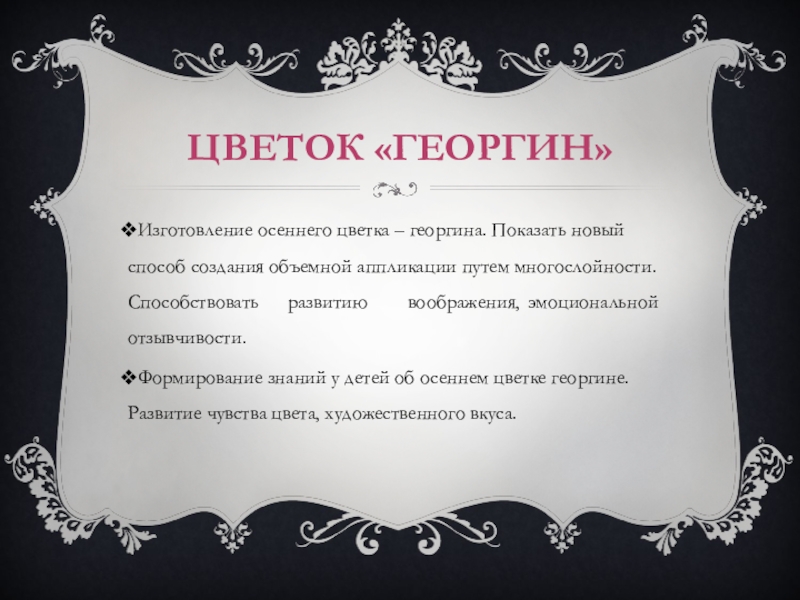Цветок «Георгин»Изготовление осеннего цветка – георгина. Показать новый способ создания объемной аппликации путем многослойности. Способствовать	развитию	воображения,	эмоциональной отзывчивости.Формирование знаний