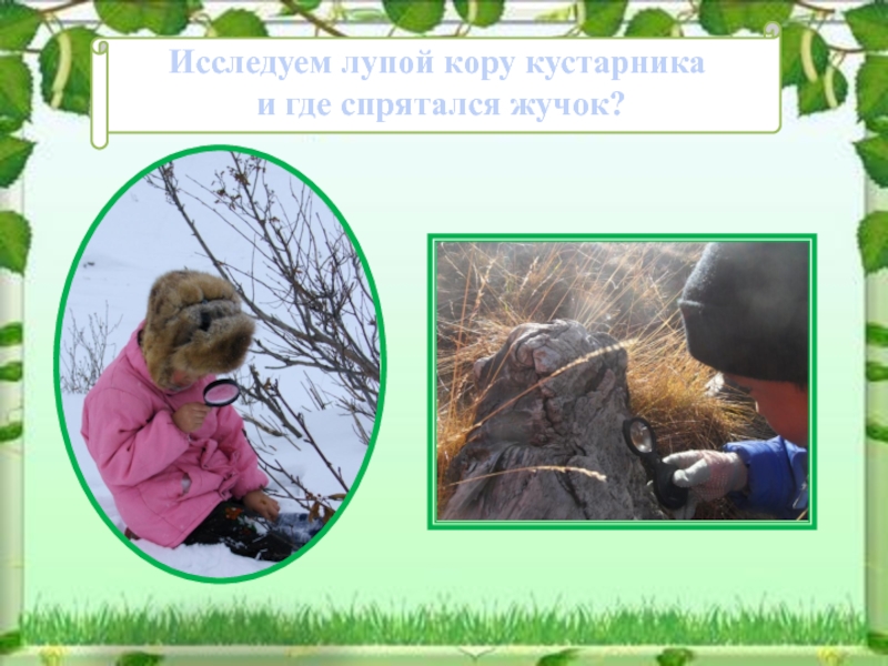 Слайд 8Исследуем лупой кору кустарника