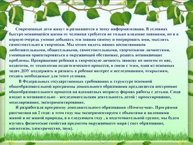 Я разработала программу дополнительного образования «Почемучка». Программа рассчитана на 2 года: в этом году мы экспериментируем с объектами и явлениями живой и не живой природы, а в следующем году , в подготовительной группе, мы будем изучать физические свойства предметов окружающего мира ( свет образование, магнетизм, электричество, звук).