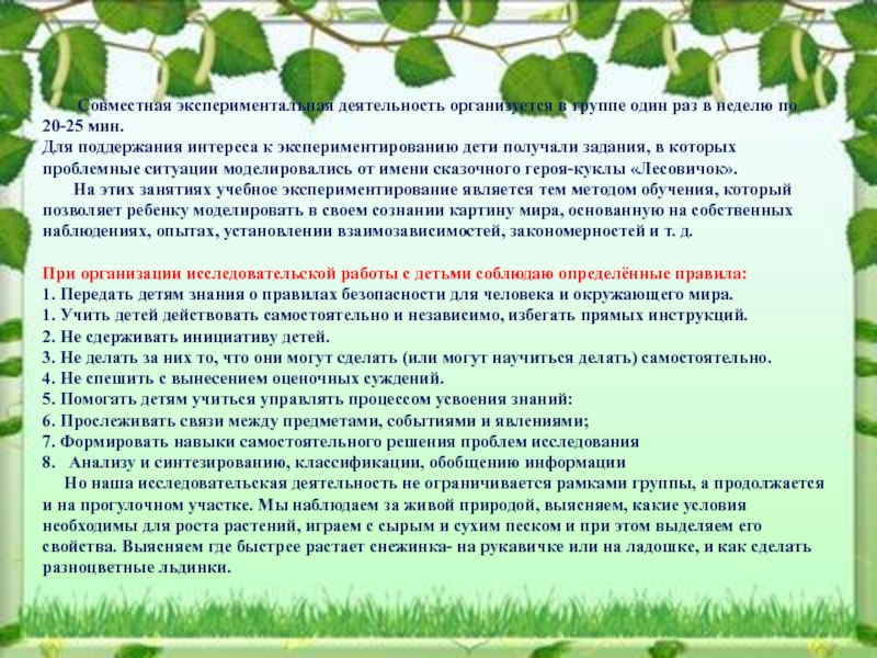 Для поддержания интереса к экспериментированию дети получали задания, в которых проблемные ситуации моделировались от имени сказочного героя-куклы «Лесовичок».
