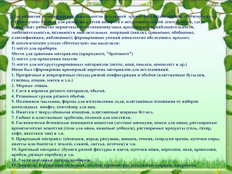 В экологическом уголке «Почемучка» мы выделили: