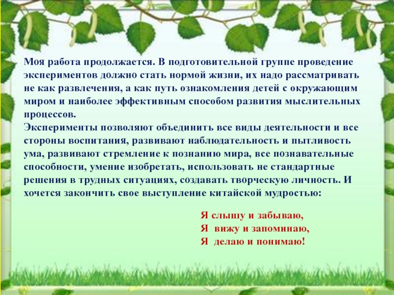 Эксперименты позволяют объединить все виды деятельности и все стороны воспитания, развивают наблюдательность и пытливость ума, развивают стремление к познанию мира, все познавательные способности, умение изобретать, использовать не стандартные решения в трудных ситуациях, создавать творческую личность. И хочется закончить свое выступление китайской мудростью: