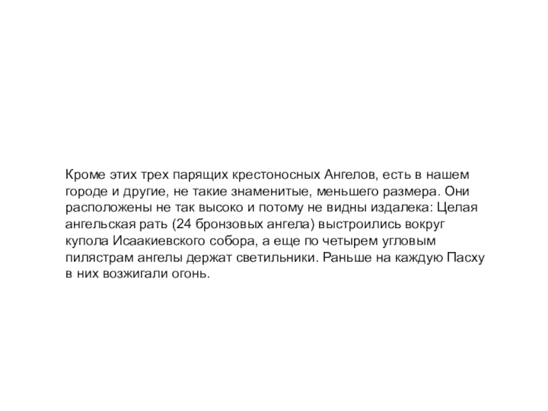 другие, не такие знаменитые, меньшего размера. Они расположены не так высоко и потому не видны издалека: Целая ангельская рать (24 бронзовых ангела) выстроились вокруг купола Исаакиевского собора, а еще по четырем угловым пилястрам ангелы держат светильники. Раньше на каждую Пасху в них возжигали огонь.