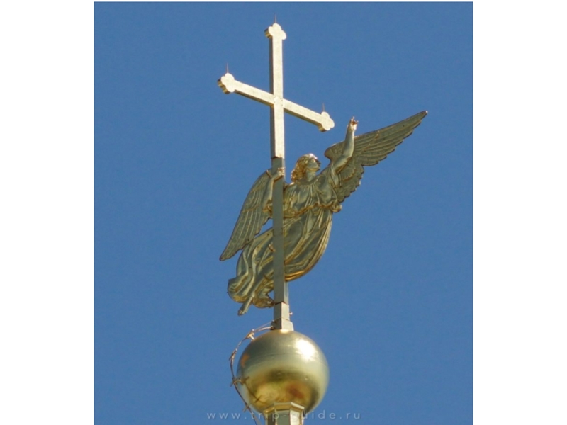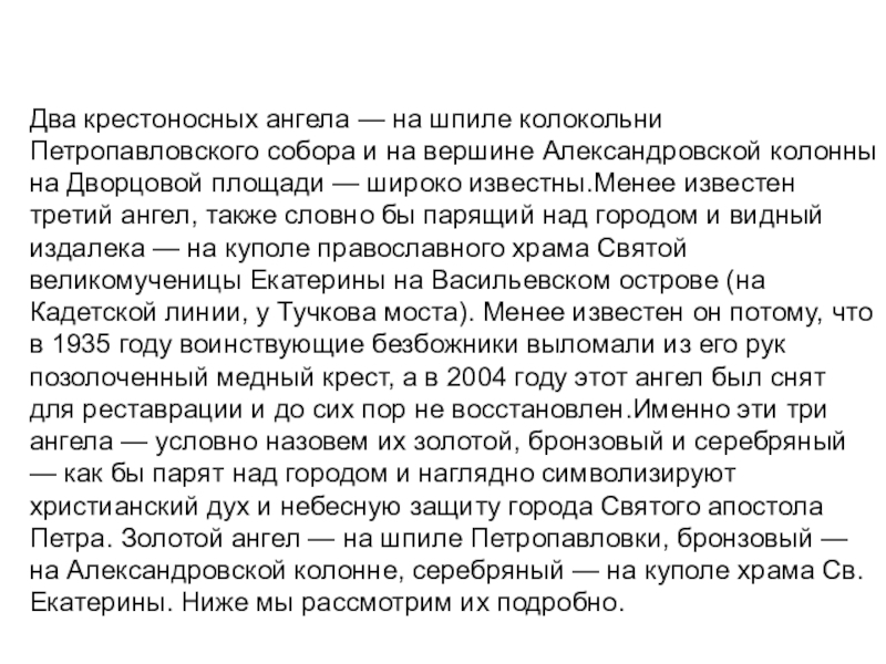 вершине Александровской колонны на Дворцовой площади — широко известны.Менее известен третий ангел, также словно бы парящий над городом и видный издалека — на куполе православного храма Святой великомученицы Екатерины на Васильевском острове (на Кадетской линии, у Тучкова моста). Менее известен он потому, что в 1935 году воинствующие безбожники выломали из его рук позолоченный медный крест, а в 2004 году этот ангел был снят для реставрации и до сих пор не восстановлен.Именно эти три ангела — условно назовем их золотой, бронзовый и серебряный — как бы парят над городом и наглядно символизируют христианский дух и небесную защиту города Святого апостола Петра. Золотой ангел — на шпиле Петропавловки, бронзовый — на Александровской колонне, серебряный — на куполе храма Св. Екатерины. Ниже мы рассмотрим их подробно.