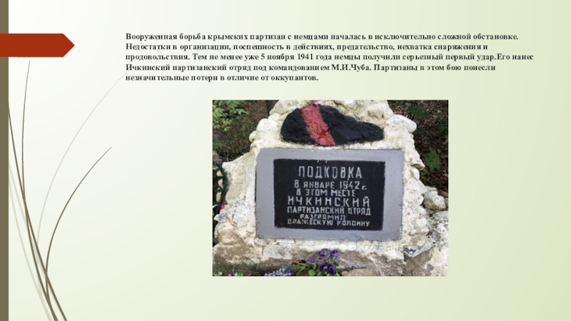Слайд 7Вооруженная борьба крымских партизан с немцами началась в исключительно сложной обстановке.