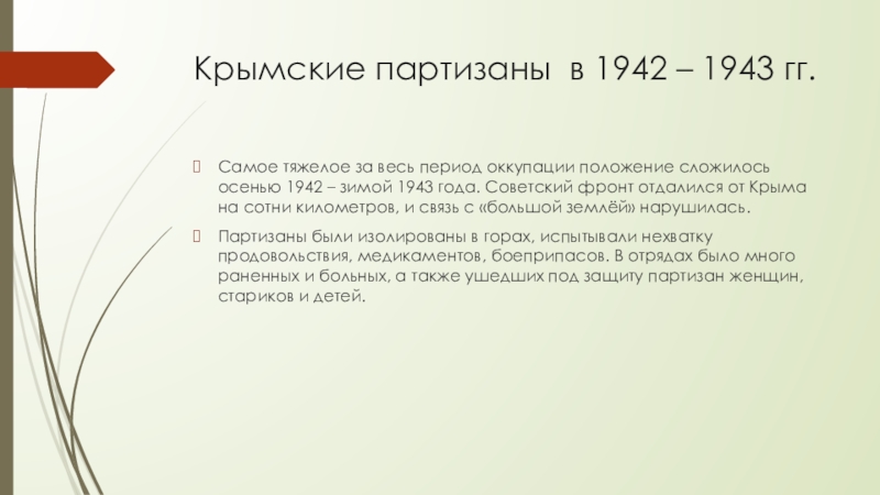 оккупации положение сложилось осенью 1942 – зимой 1943 года. Советский фронт отдалился от Крыма на сотни километров, и связь с «большой землёй» нарушилась.