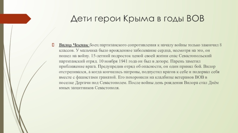 началу войны только закончил 8 классов. У мальчика было врожденное заболевание сердца, несмотря на это, он пошел на войну. 15-летний подросток ценой своей жизни спас Севастопольский партизанский отряд. 10 ноября 1941 года он был в дозоре. Парень заметил приближение врага. Предупредив отряд об опасности, он один принял бой. Вилор отстреливался, а когда кончились патроны, подпустил врагов к себе и подорвал себя вместе с фашистами гранатой. Его похоронили на кладбище ветеранов ВОВ в поселке Дергачи под Севастополем. После войны день рождения Вилора стал Днём юных защитников Севастополя.