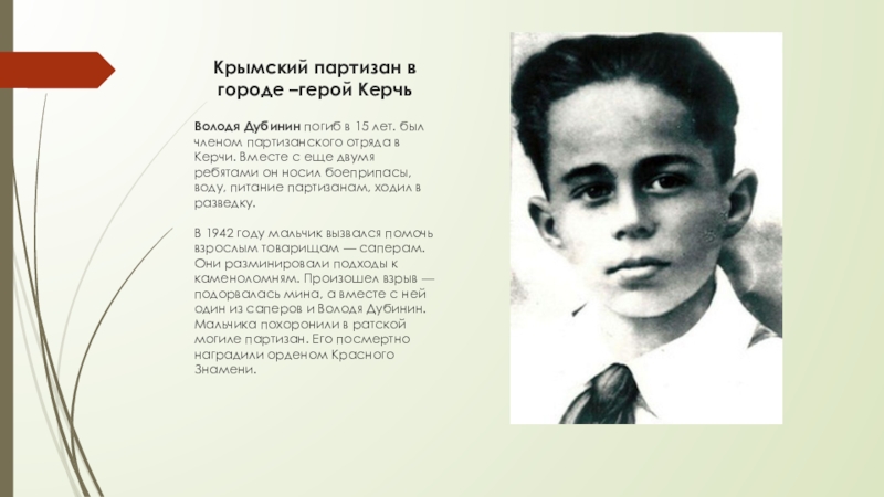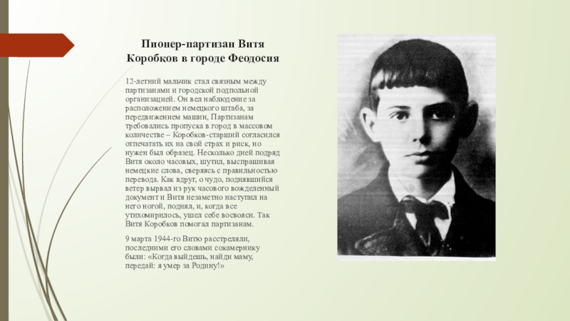 Слайд 6Пионер-партизан Витя Коробков в городе Феодосия