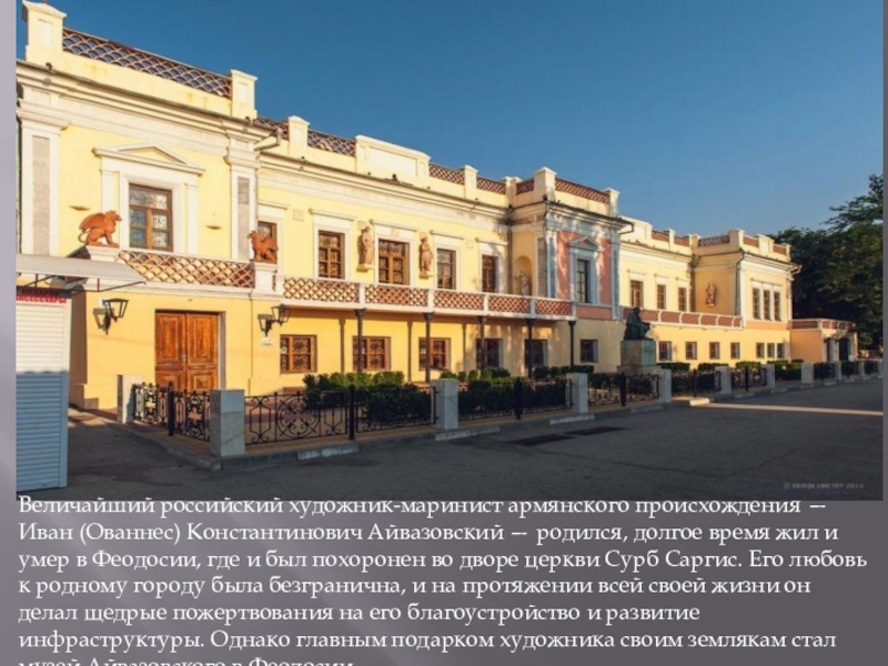 крыльев особняка, где художник жил с семьей, открыл в конце 1840 годов. Тогда все желающие могли увидеть собрание, состоящее из 49 полотен мариниста, которые ожидали отправки на выставки в различные страны Европы и в Санкт-Петербург. В 1880 году к особняку была пристроена галерея, спроектированная самим Айвазовским, которая стала первым в России музеем одного художника. Галерея в доме Айвазовского при его жизни также выполняла функции концертного зала, где часто выступали известные музыканты и актеры. Таким образом, благодаря художнику в конце 19 века Феодосия стала центром культурной жизни Крымского полуострова, куда стремились попасть и иностранные путешественники.