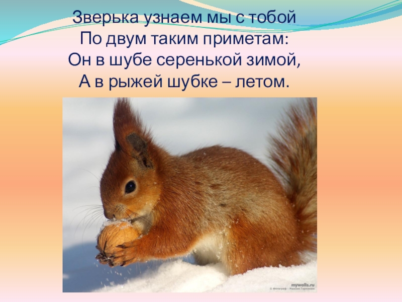 Зверька узнаем мы с тобой По двум таким приметам: Он в шубе серенькой зимой, А в рыжей
