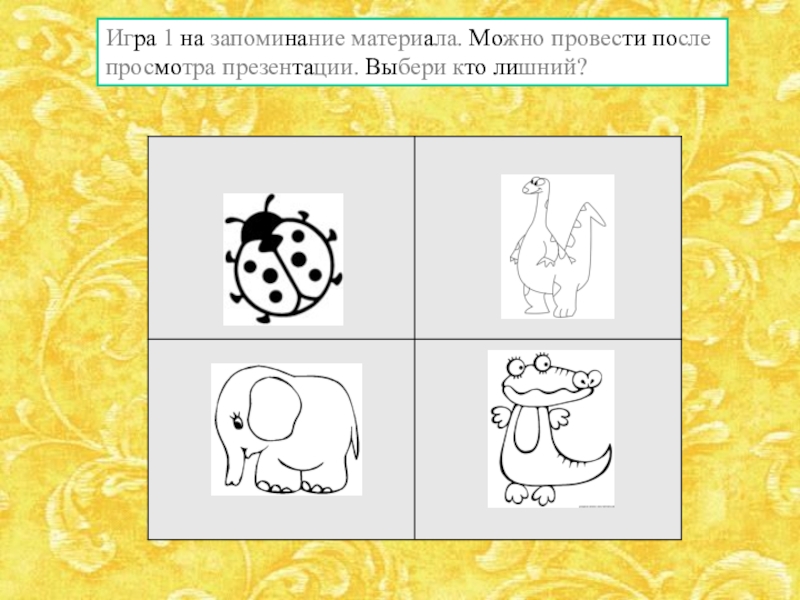 Игра 1 на запоминание материала. Можно провести после просмотра презентации. Выбери кто лишний?