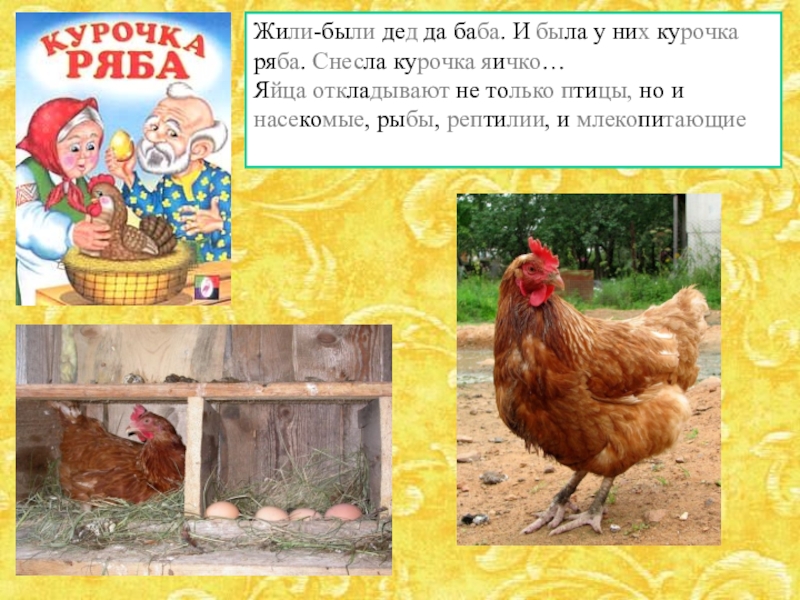 Жили-были дед да баба. И была у них курочка ряба. Снесла курочка яичко… Яйца откладывают не только