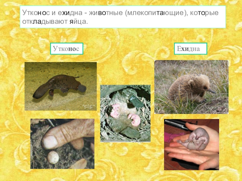 Слайд 14Утконос и ехидна - животные (млекопитающие), которые откладывают яйца.