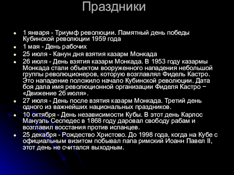 Праздники 1 января - Триумф революции. Памятный день победы Кубинской революции 1959 года1 мая - День рабочих25