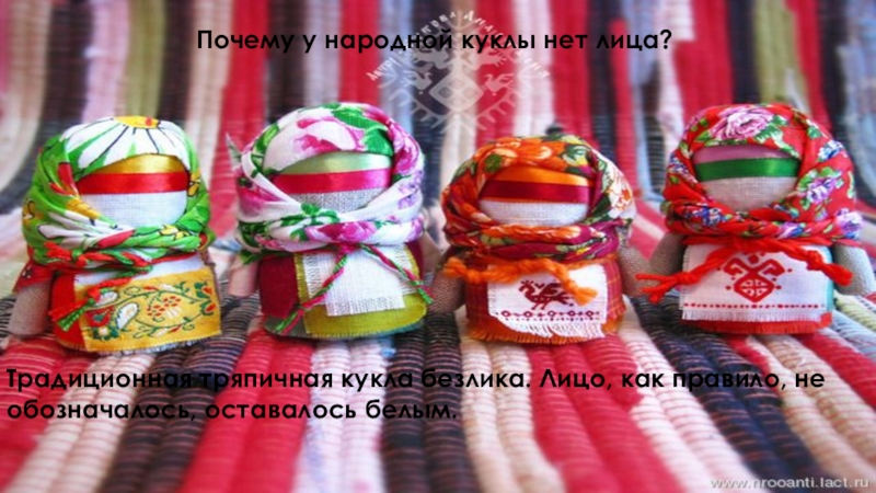 Почему у народной куклы нет лица?Традиционная тряпичная кукла безлика. Лицо, как правило, не обозначалось, оставалось белым.