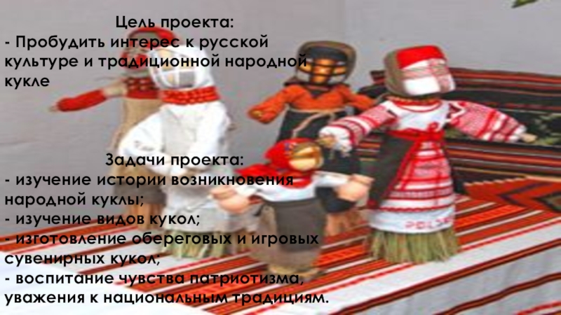 Цель проекта:- Пробудить интерес к русской культуре и традиционной народной куклеЗадачи проекта:- изучение истории возникновения народной куклы;-