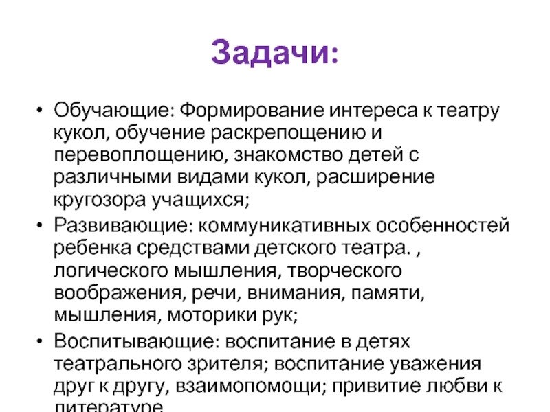 Обучающие: Формирование интереса к театру кукол, обучение раскрепощению и перевоплощению, знакомство