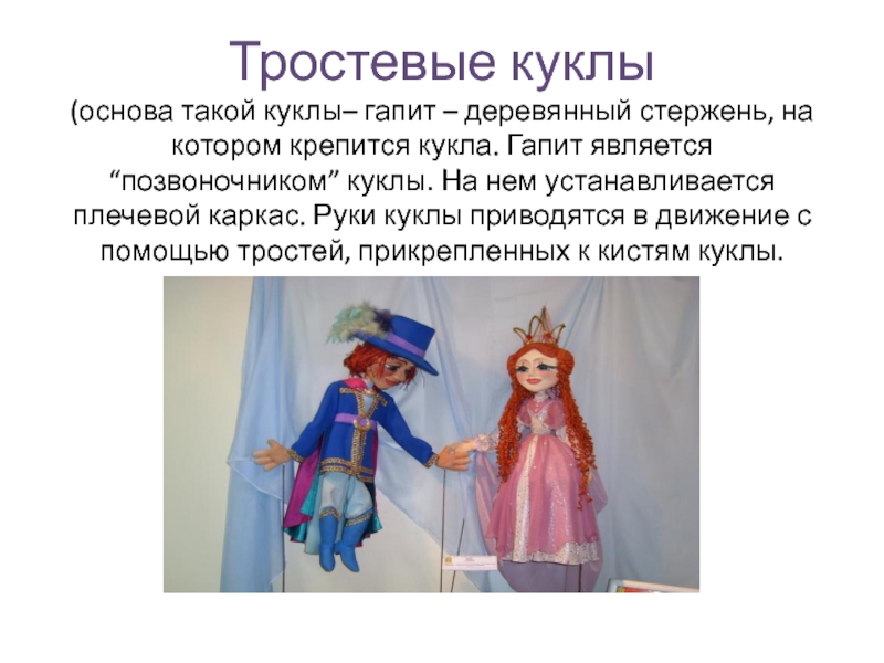 тростевые куклы (основа такой куклы– гапит – деревянный стержень, на котором крепится кукла. Гапит является “позвоночником” куклы. На нем устанавливается плечевой каркас. Руки куклы приводятся в движение с помощью тростей, прикрепленных к кистям куклы.