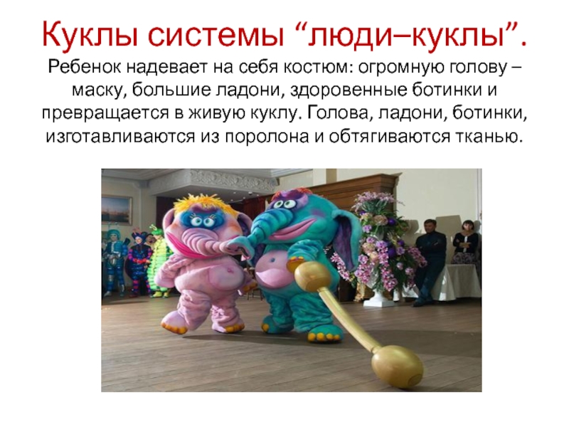 куклы системы “люди–куклы”. Ребенок надевает на себя костюм: огромную голову – маску, большие ладони, здоровенные ботинки и превращается в живую куклу. Голова, ладони, ботинки, изготавливаются из поролона и обтягиваются тканью. Люди-куклы обладают яркими сценическими возможностями. Управление такими куклами доставляет детям огромную радость.