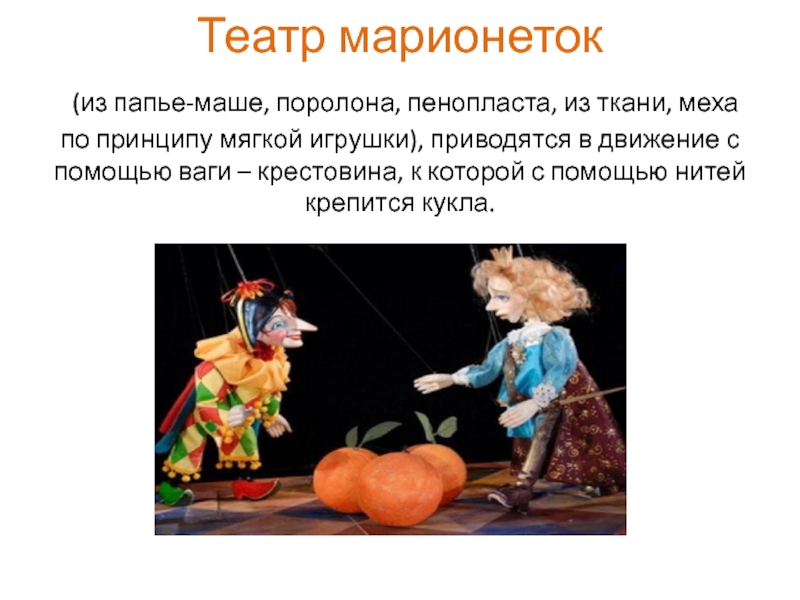 театр марионеток (из папье-маше, поролона, пенопласта, из ткани, меха по принципу мягкой игрушки), приводятся в движение с помощью ваги – крестовина, к которой с помощью нитей крепится кукла;